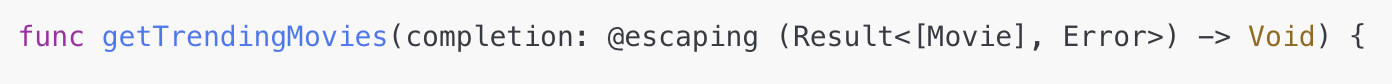 - 트렌딩 영화를 가져오는 비동기 함수를 정의한다. 결과는 Result<[Movie], Error> 타입의 클로저로 반환된다.
