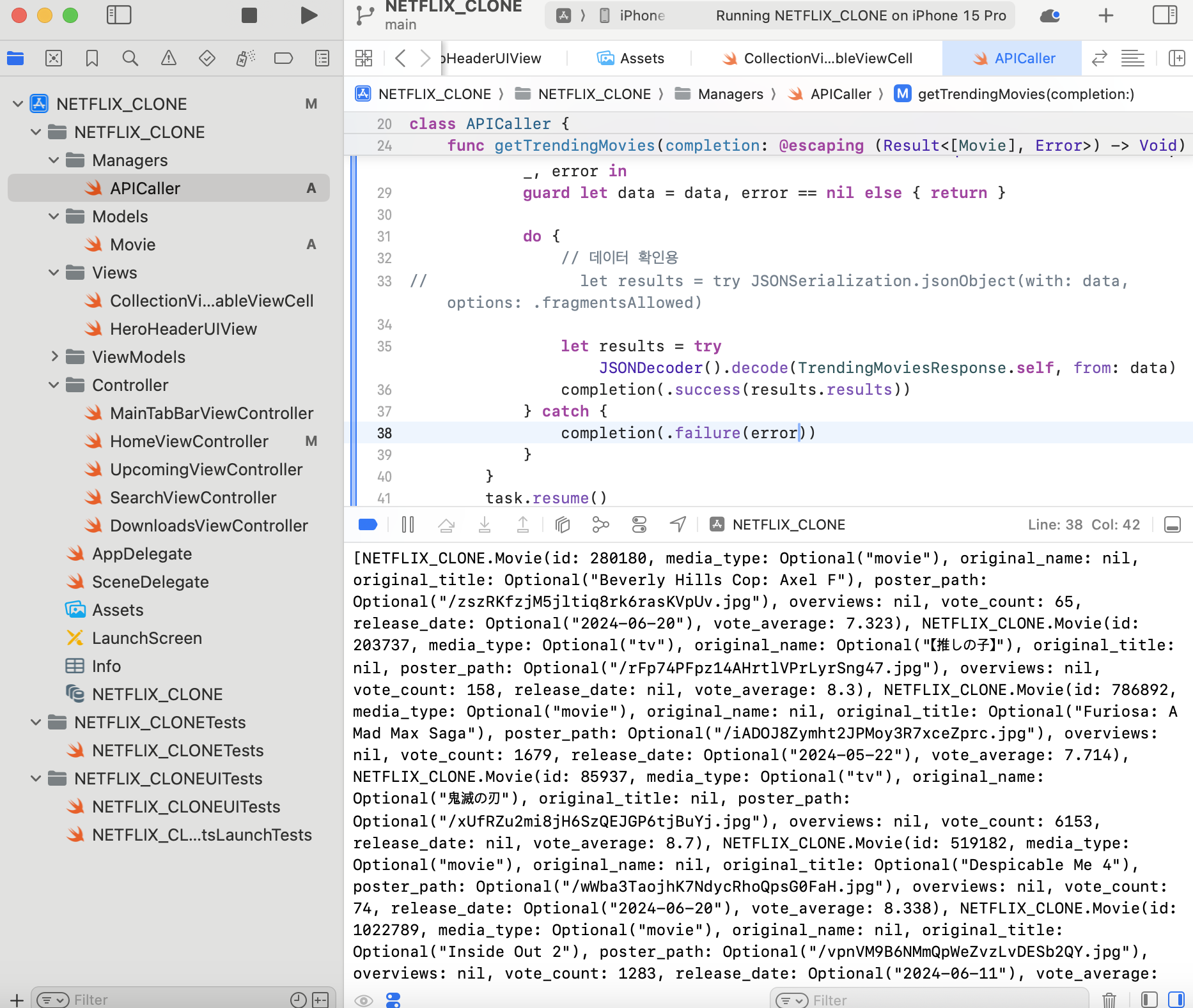 - APICaller라는 클래스를 사용하여 TMDb(The Movie Database) API에서 트렌딩 영화를 가져오는 기능을 구현한 것이다.