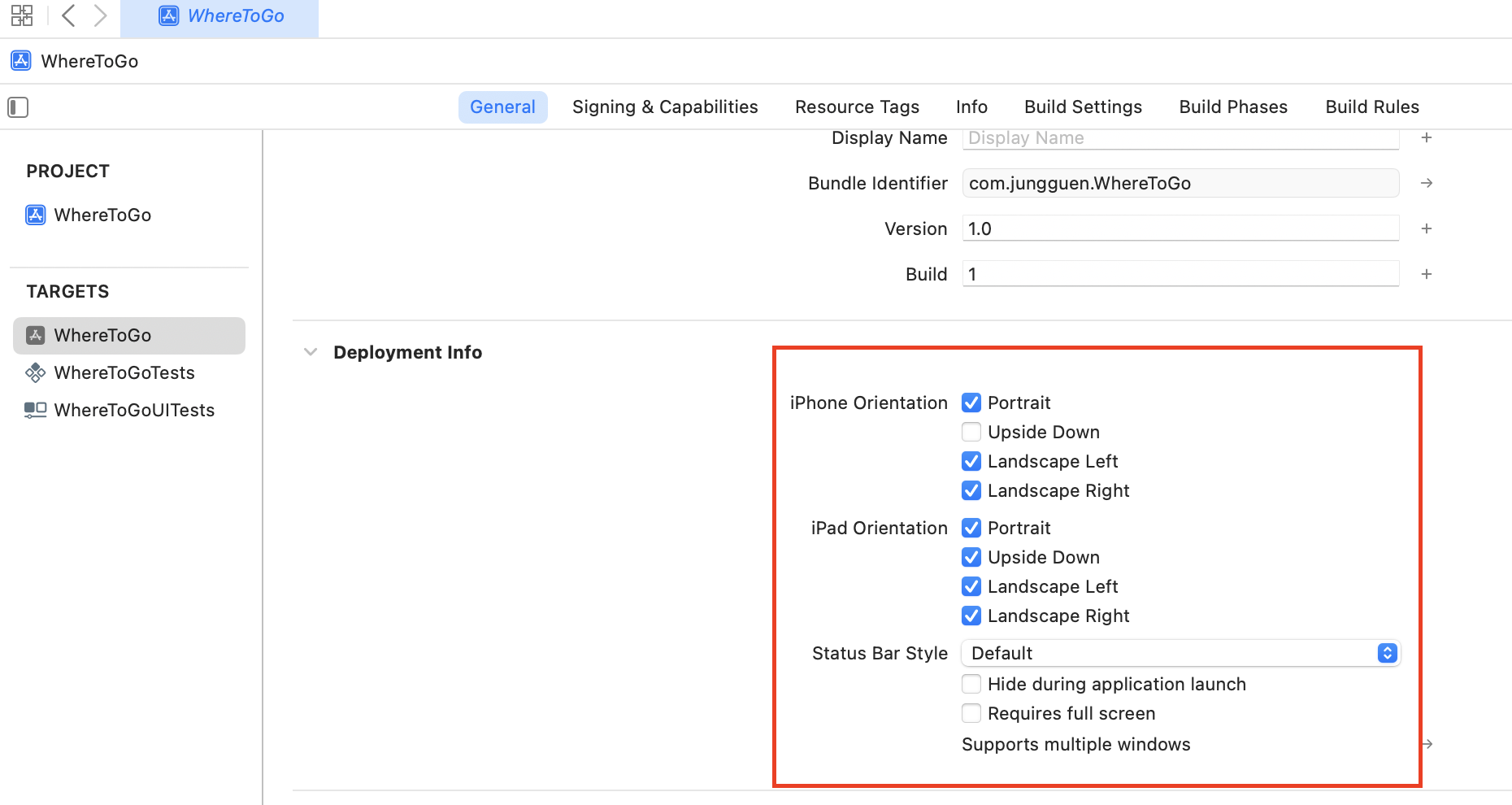 - Deployment Info 섹션: General 탭의 "Deployment Info" 섹션에서 "Device Orientation" 옵션을 찾습니다.