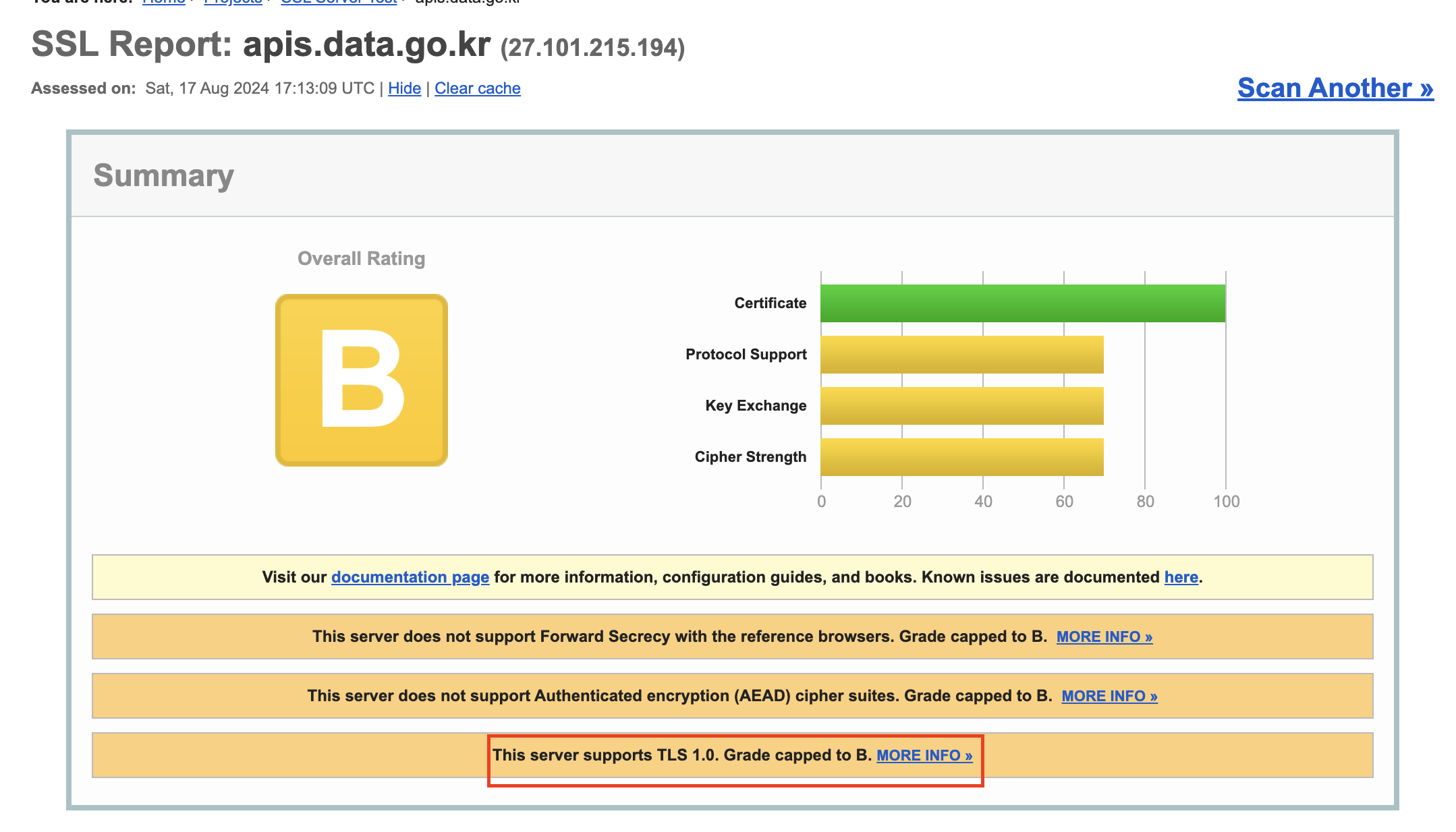서버에 대한 SSL을 테스트한 결과 해당 서버는 TLS 1.0을 지원한다고 되어 있습니다.