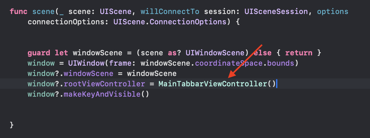 SceneDelegate 파일 내에서 "willConnectTo" 의 함수에서 rootViewController에