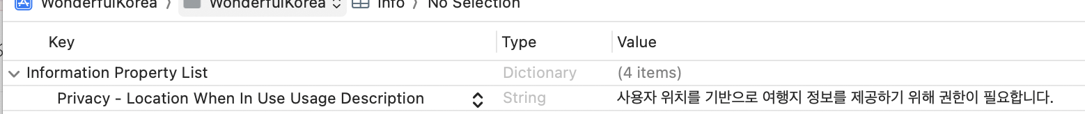 CoreLocation을 사용해보자 대부분의 프레임워크들은 매니저와 같은 중심부가 구현되어있음 locations - 배열로 들어옴(무슨 해양,, 그런거까지 정보가 많음) Privacy - Location When In Use Usage Description ->