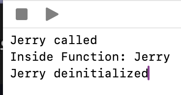 - createPerson() 함수가 끝나면 jerry을 참조하는 코드가 더 이상 없기 때문에 참조 카운트가 0이 되고, ARC에 의해 jerry 객체는 메모리에서 해제됩니다. 그러면 deinit이 실행되어 콘솔에 "Jerry deinitialized." 메시지가 출력됩니다.