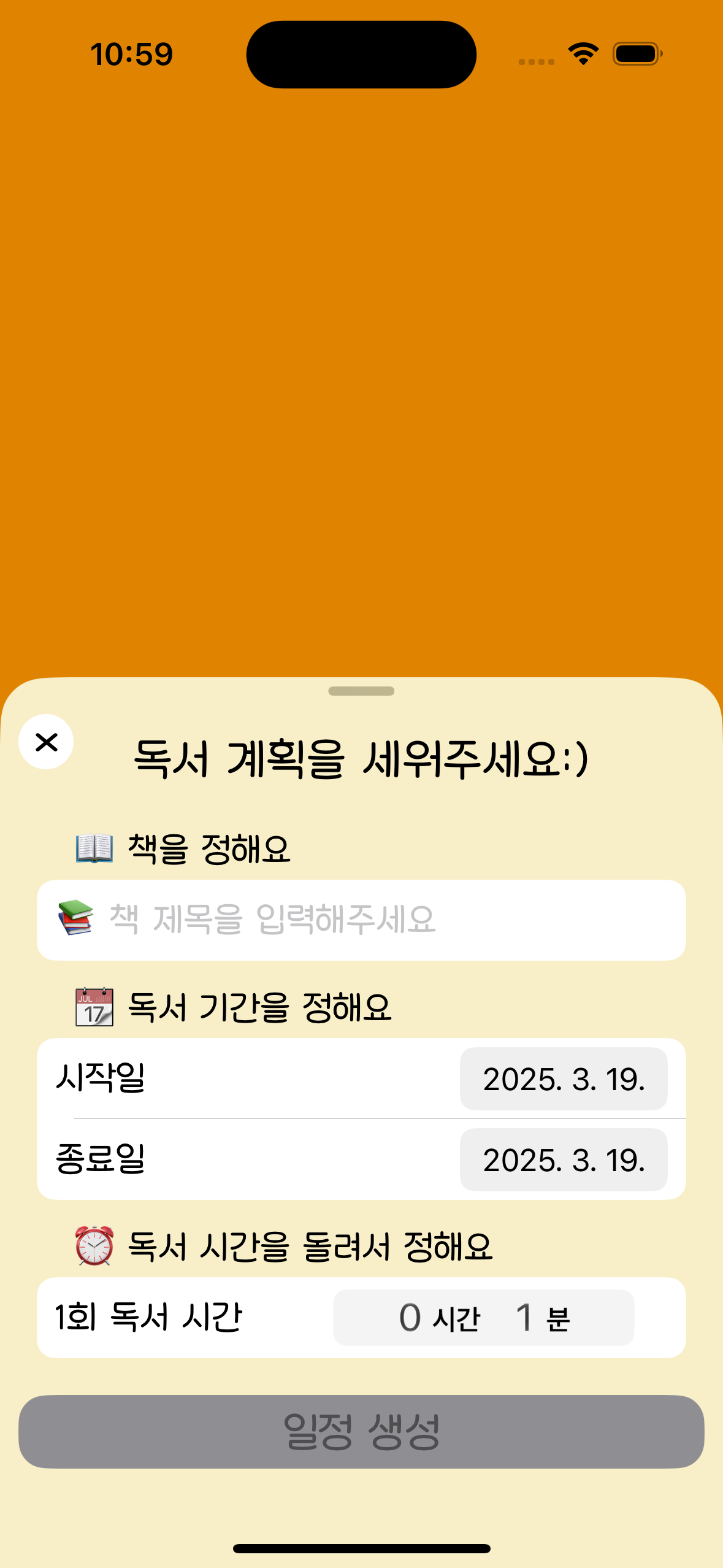 독서 계획을 세울 때, 책 제목은 2글자 이상, 독서 시간은 5분 이상이어야지만 일정 생성 버튼이 활성화