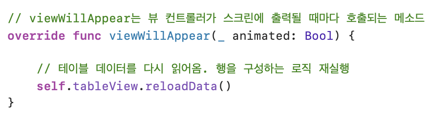 따라서 화면이 출력될 때마다 동작하는 viewWillAppear 메소드에 구현