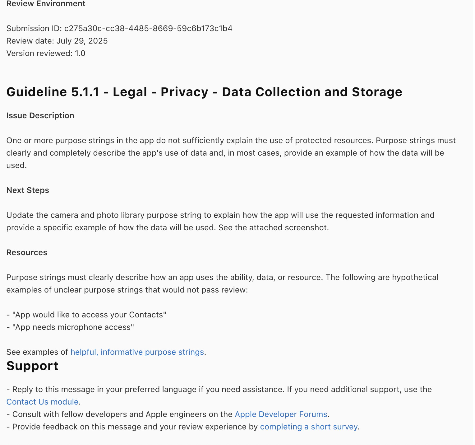 “One or more purpose strings in the app do not sufficiently explain the use of protected resources.”