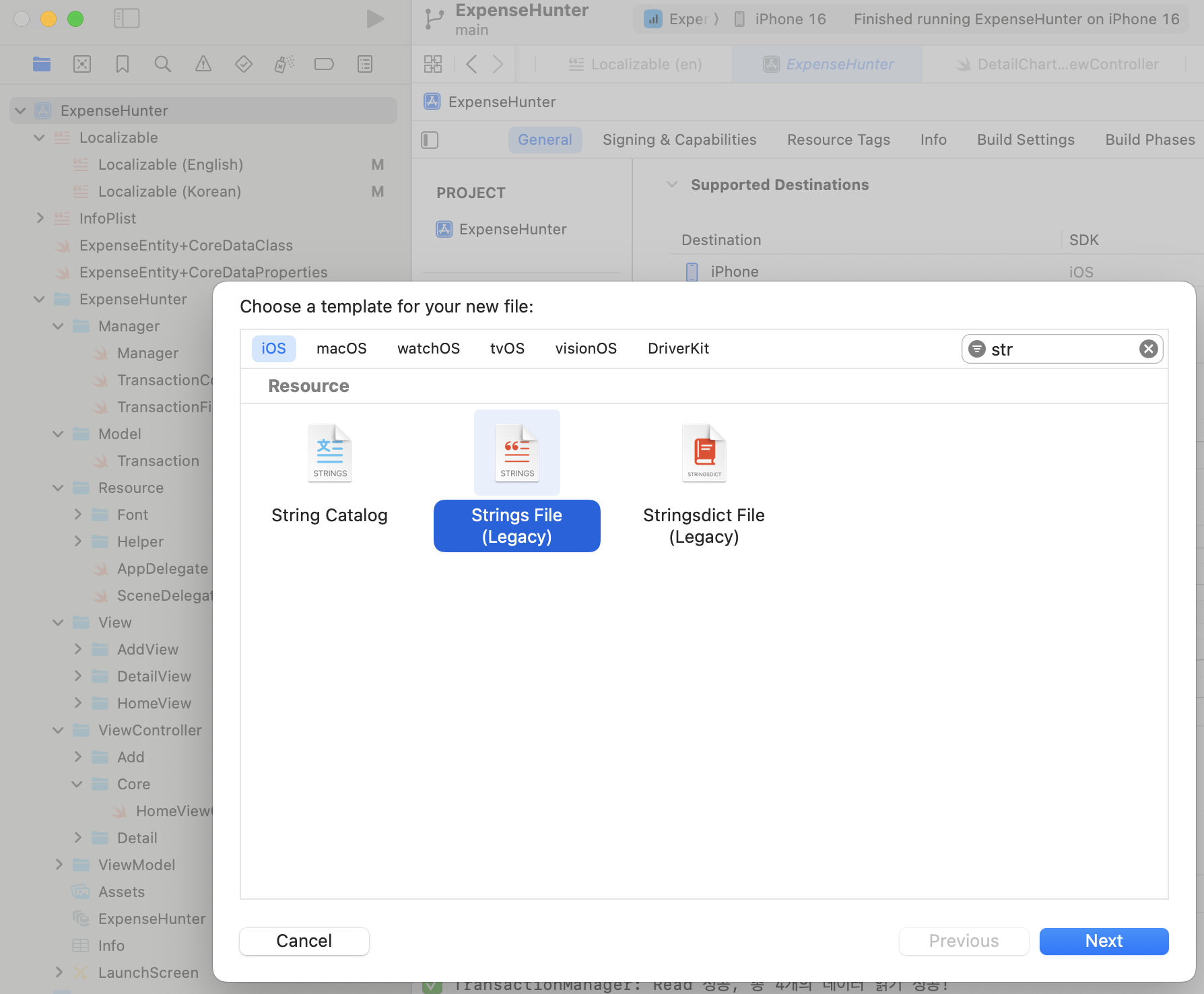 - Strings File 선택 → 파일 이름을 Localizable.strings 로 입력