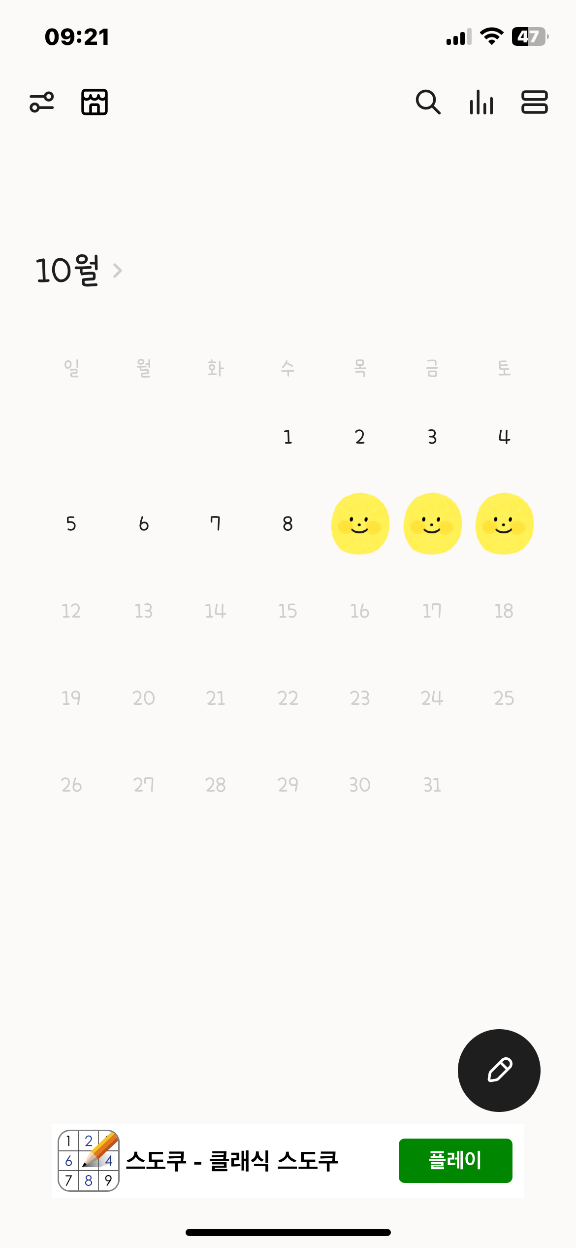 대부분은 한 달 단위의 달력을 보여주고, 각 날짜별로 작성한 일기 속 감정 이모티콘을 표시하죠.