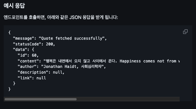 보통 이 API는 JSON 형식으로 명언 데이터를 내려줘요.