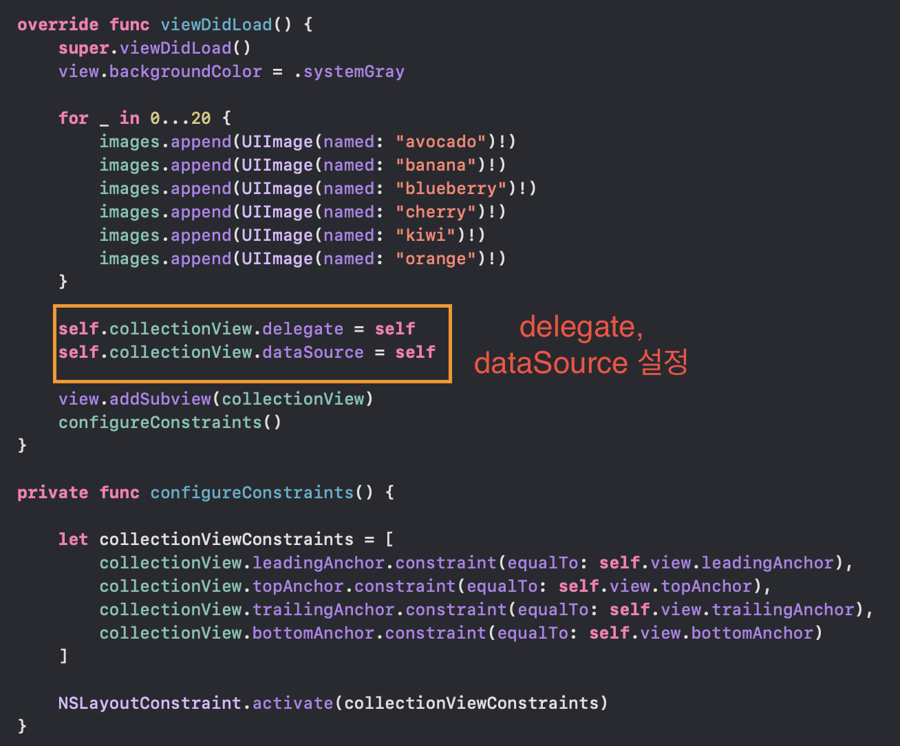 다시 viewController.swift 파일로 돌아와 UICollectionViewDelegate, UICollectionViewDataSource 프로토콜을 채택함